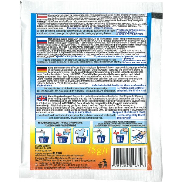Jest to preparat usztywniająco-wybielający do płukania uprzednio wypranej tkaniny, doskonale rozpuszczalny w chłodnej wodzie. Usztywnia i wybiela bieliznę stołową (obrusy, serwety), pościelową (poszewki, poszwy, prześcieradła, zasłony) oraz inne tkaniny wymagające krochmalenia (koszule, bluzki, fartuchy, czepki kucharskie, pielęgniarskie itp.). Roztwór o małym stężeniu znajduje również zastosowanie do wyrobów z kory. Najlepszy efekt osiąga się zanurzając kilkakrotnie tkaninę w świeżo przygotowanym roztworze.
