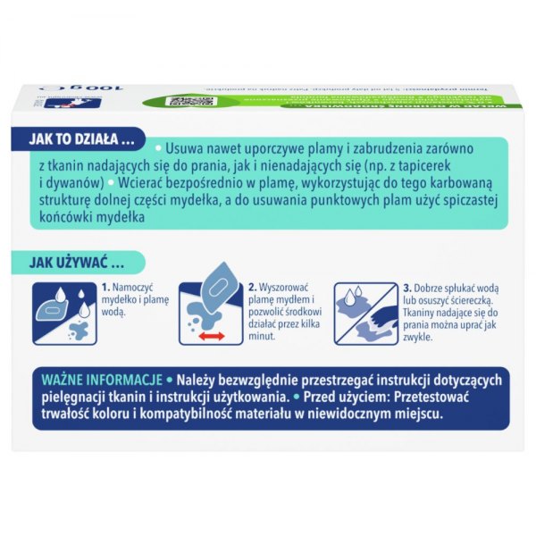 Mydełko do odplamiania to sprawdzony środek na plamy. Usuwa nie tylko plamy z tkanin, które można prać w wodzie, lecz także plamy z dywanów i mebli tapicerowanych (sof, wersalek, foteli samochodowych).