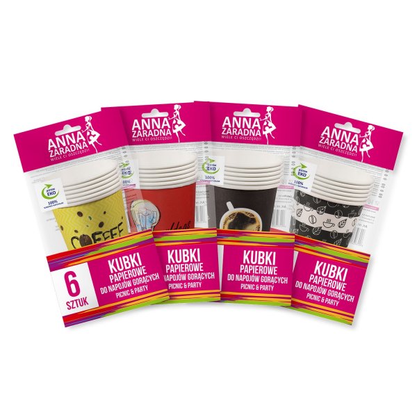 Papierowe kubki do napojów zimnych i gorących. Doskonale nadają się na imprezy okolicznościowe w domu i na świeżym powietrzu, sprawdzają się także podczas grilli, pikników czy wycieczek. Niezastąpione w każdym barze szybkiej obsługi. Opakowanie posiada fukncjonalną tasiemkę z klejem pozwalającą na wielokrotme owieranie i zamykanie woreczka. Kubeczki dostępne w czterech óżnych wzorach. W opakowaniu jeden wzór nadruku, w kartonie mix wzorów. Maksymalna temperatura użytkowania kubka to 70 st C do 1 godziny.