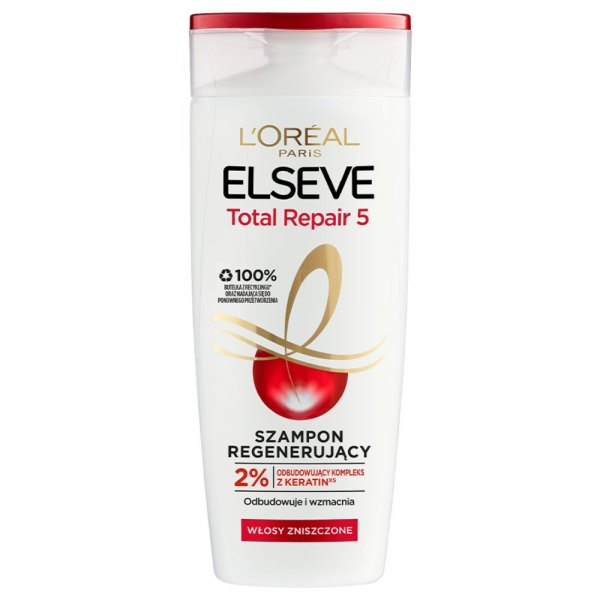 Szampon Elseve Total Repair 5 wzbogacony w 2% kompleks odbudowujący KERATIN XS intensywnie regeneruje włosy i zapewnia 5 rezultatów dla zniszczonych włosów: odporność, witalność, połysk, jedwabistość i miękkość.
