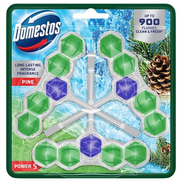 Kostka toaletowa Domestos Power 5 to kompleksowy produkt, dzięki któremu Twoja toaleta będzie czysta i bezpieczna. Zapewnia długotrwały, intensywny zapach, czystość i ochronę przed nadbudowywaniem się kamienia aż do 300 spłukań na kostkę!