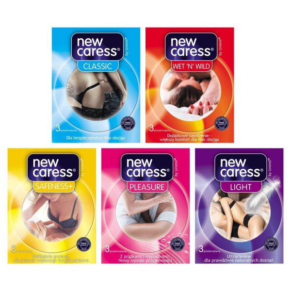 New Caress Multigross to mix prezerwatyw w którego skład wchodzi 48 opakowań po 3 prezerwatywy w 5 rodzajach: